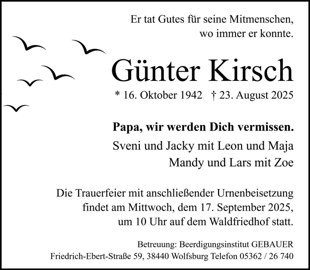 Leider kann ich an der Urnenbeisetzung nicht teilnehmen - werde aber an euch denken und Günter ein ehrenvolles Andenken bewahren.