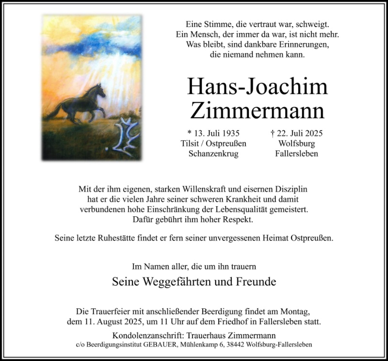 Alles hat seine Zeit. Hans Joachim Zimmermann war einer unserer Besten in der Klasse 8 B der Holstenschule in Rendsburg,klug,pfiffig und stark , eben ein Ostpreuße. Er hat an allen Klassentreffen der vergangenen Jahre teilgenommen. War immer großzügig!! Wir lassen die Hand los ;aber nicht den Menschen . Ruhe in Frieden . Deine Freunde aus der 8B Günter Gimm Hans Heinrich Höhl, Herbert Funk und Heinz Johannsen (Jimmy) die letzten von 42
