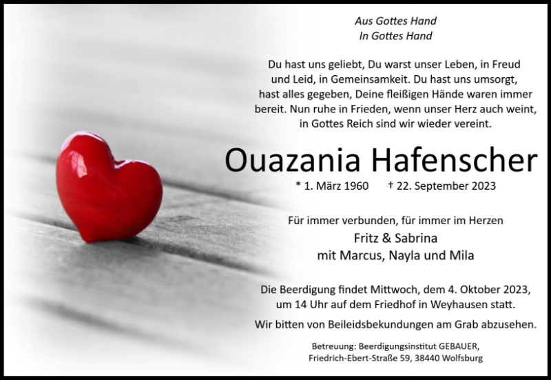Ouazania hat mich so stark berührt, Ihren Glaube an Jesus Christus unserem Erlöser hat sie voller Liebe und Hingabe weiter getragen. Sie war für mich im Glauben und in der Freundschaft ein wichtiger Begleiter. Ich vermisse Sie so sehr, weiß aber mit Gewissheit dass es ihr bei Jesus gut geht und freue mich auf unser Wiedersehen in der Ewigkeit.